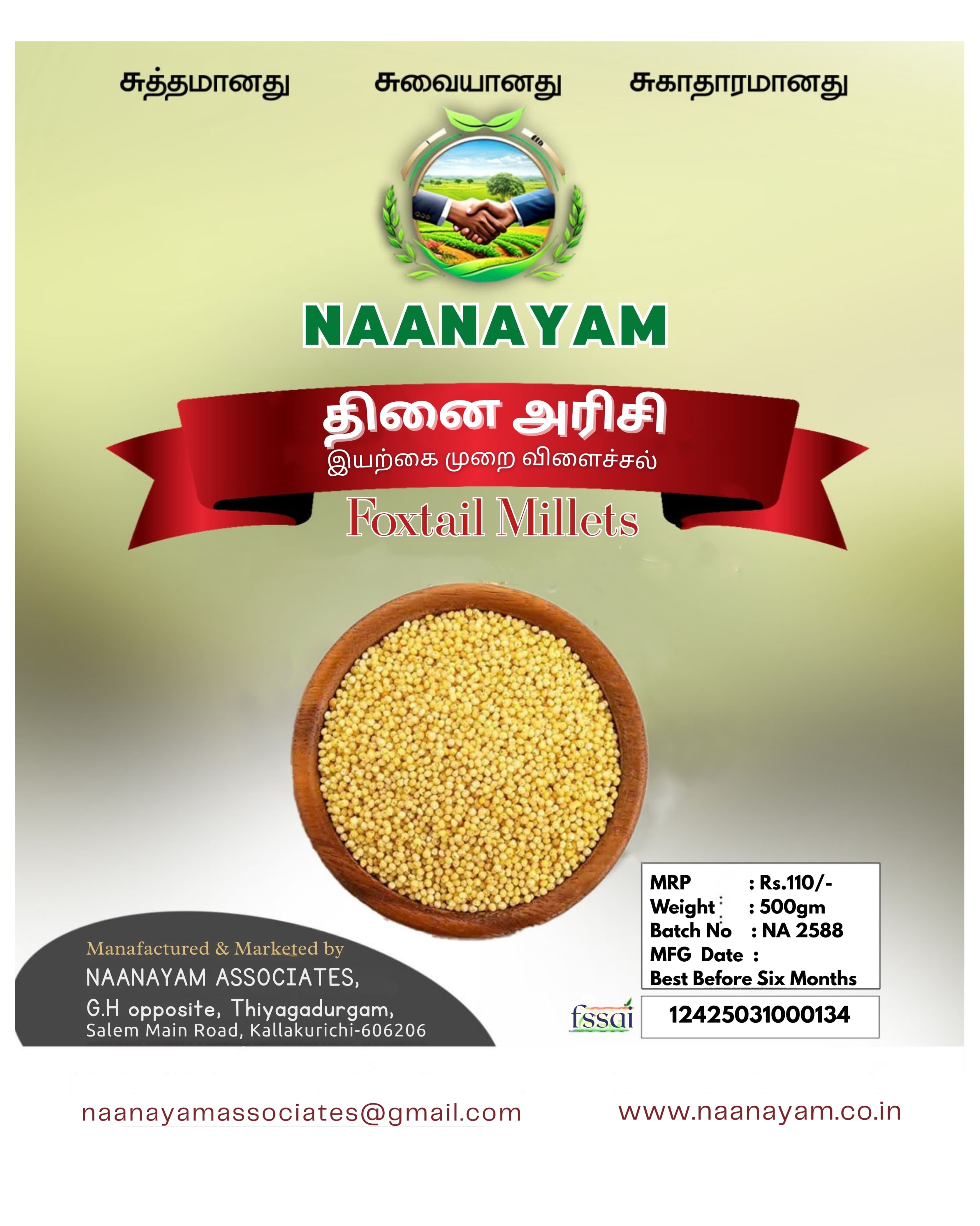 திணை அரிசி பல நன்மைகளை கொண்டுள்ளது. இதில் வைட்டமின் பி1, பாஸ்பரஸ், மெக்னீசியம், இரும்புச்சத்து, சுண்ணாம்புச்சத்து, நார்ச்சத்து, மாவுச்சத்து, கொழுப்புச்சத்து போன்ற பல சத்துக்கள் உள்ளன.